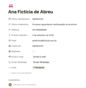 A ideia é: para cada 100 processos ativos, realizo 5 atendimentos por dia — organizados de forma automatizada, com registro no Notion e disparos automáticos via Make (integração com e-mail e WhatsApp).